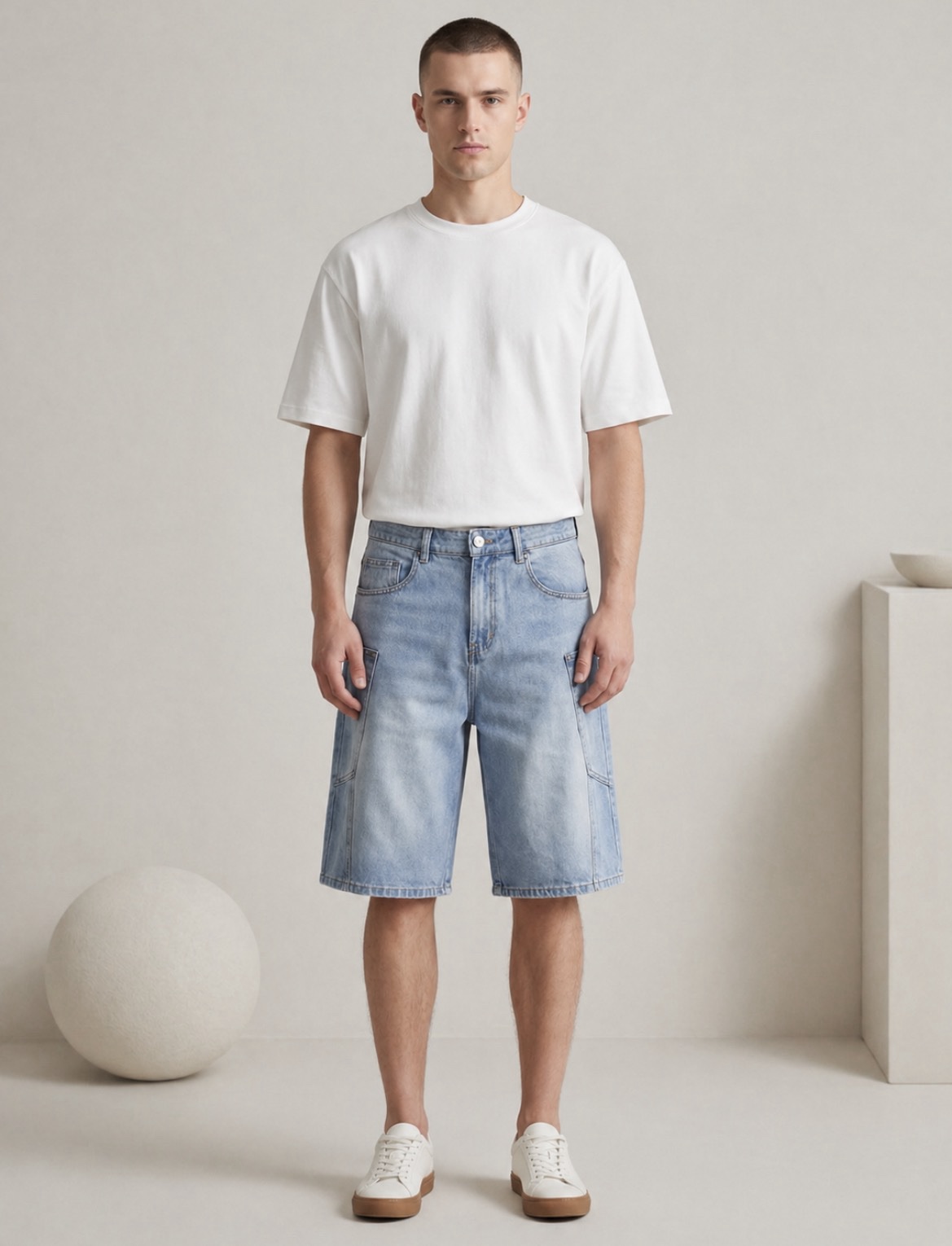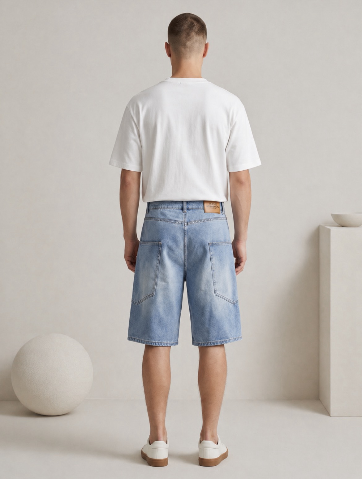 Άνετη και πρακτική αντρική βερμούδα από denim ύφασμα, ιδανική για καθημερινές εμφανίσεις. Κλασική γραμμή που συνδυάζεται εύκολα με t-shirt και sneakers για casual στυλ.