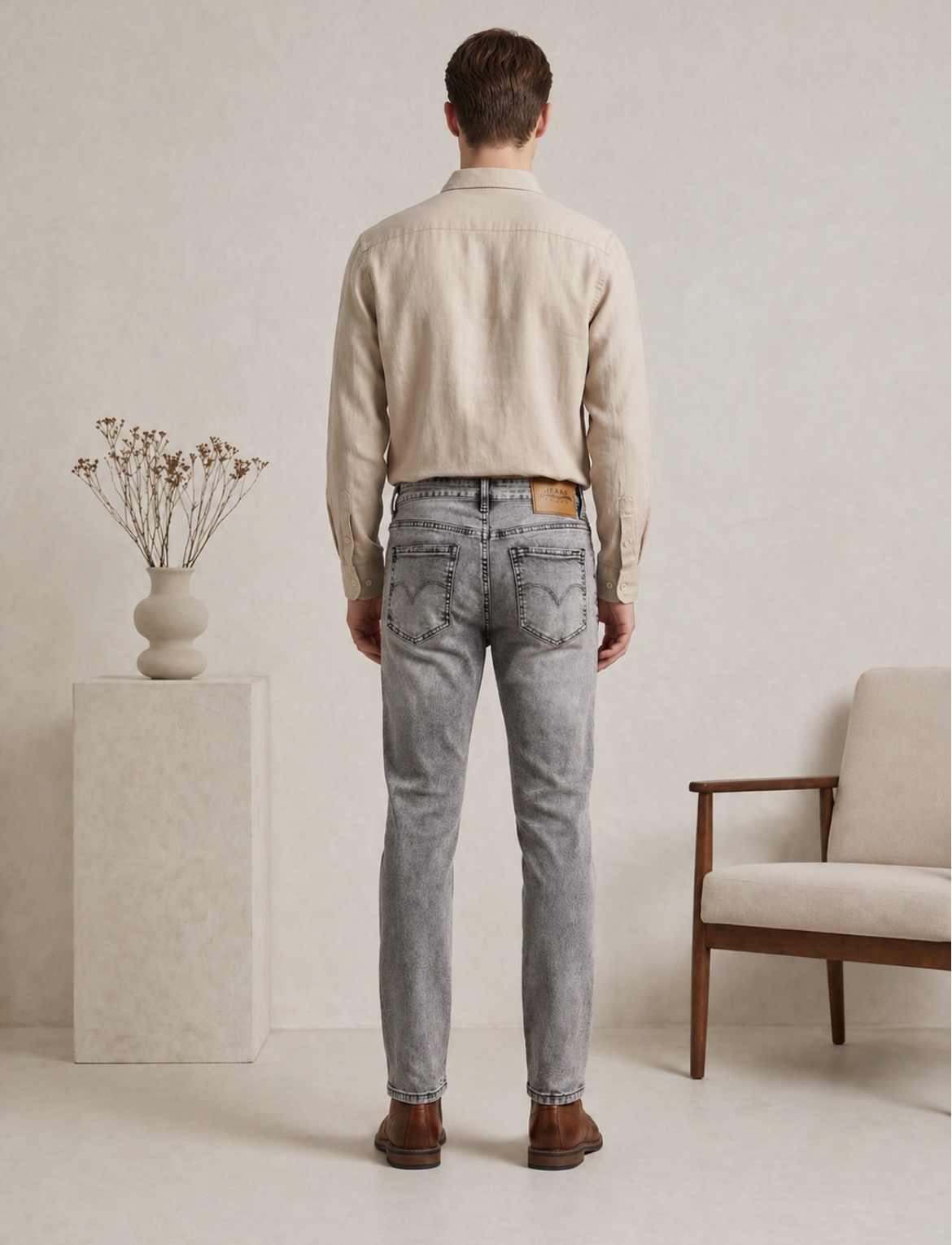 Μοντέρνο αντρικό τζιν παντελόνι σε γκρι απόχρωση, ιδανικό για καθημερινό αλλά και πιο προσεγμένο ντύσιμο. Αγκαλιάζει το σώμα χωρίς να περιορίζει, προσφέροντας άνεση και στυλ όλη μέρα.