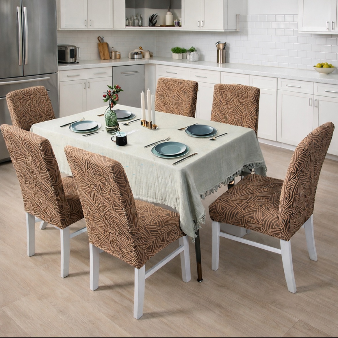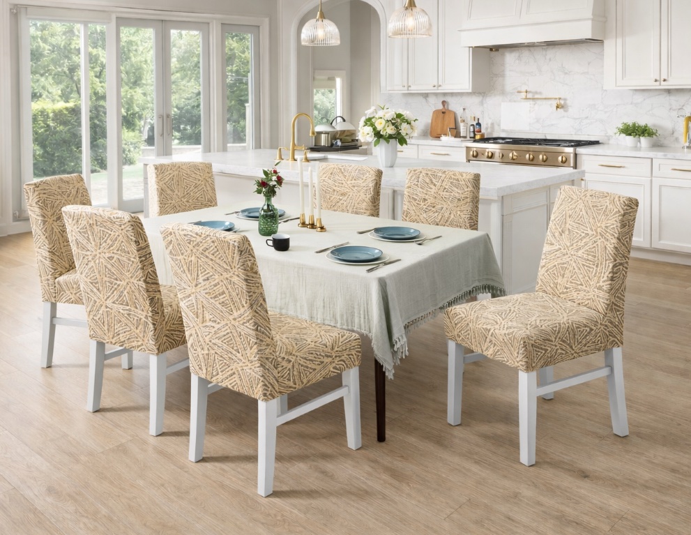 Ανανεώστε εύκολα και οικονομικά τις καρέκλες της τραπεζαρίας ή της κουζίνας σας με αυτό το κομψό κάλυμμα καρέκλας. Ο μοντέρνος γεωμετρικός σχεδιασμός σε μπεζ και γκρι αποχρώσεις προσφέρει ζεστή και elegant αισθητική, ενώ το ελαστικό ύφασμα εφαρμόζει σωστά και σταθερά, καλύπτοντας πλήρως την καρέκλα και προστατεύοντάς την από λεκέδες, φθορές και καθημερινή χρήση. Ιδανικό για καθημερινή χρήση αλλά και για ανανέωση χώρου χωρίς αλλαγή επίπλων.