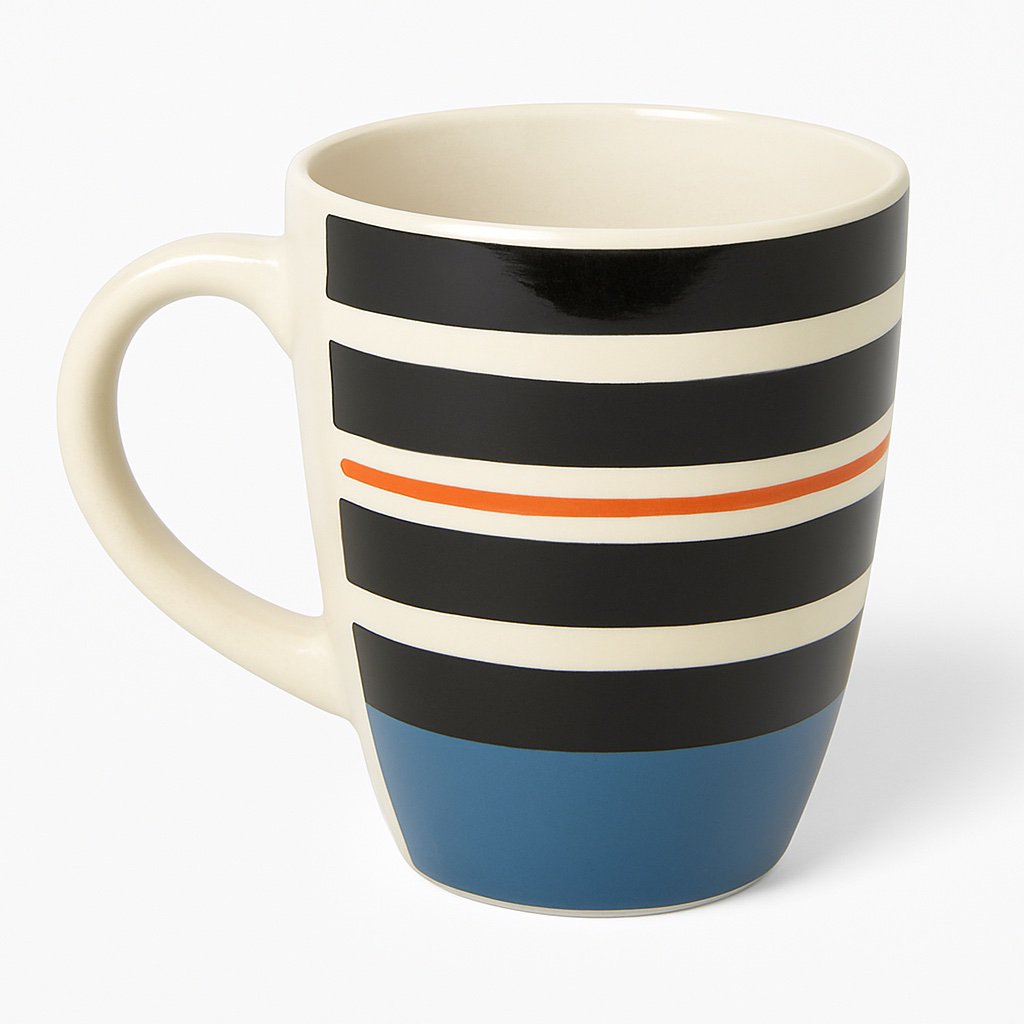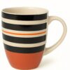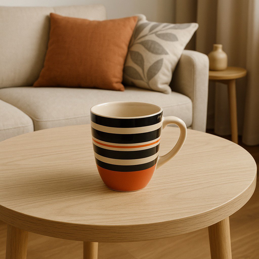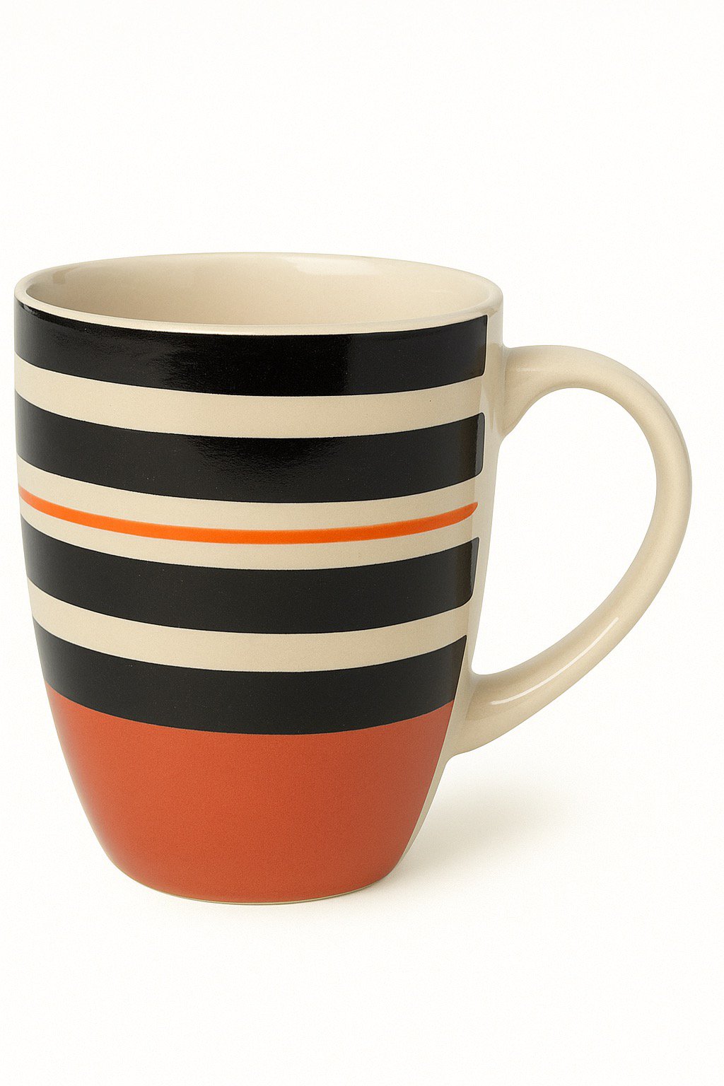 Μοντέρνα κεραμική κούπα με ριγέ σχέδιο σε μαύρο, μπεζ και διακριτική πορτοκαλί λεπτομέρεια. Διαθέτει άνετη λαβή, ιδανική για καφέ, τσάι ή ζεστή σοκολάτα. Ο συνδυασμός των χρωμάτων δίνει μια κομψή και ζεστή αισθητική που ταιριάζει σε κάθε κουζίνα.