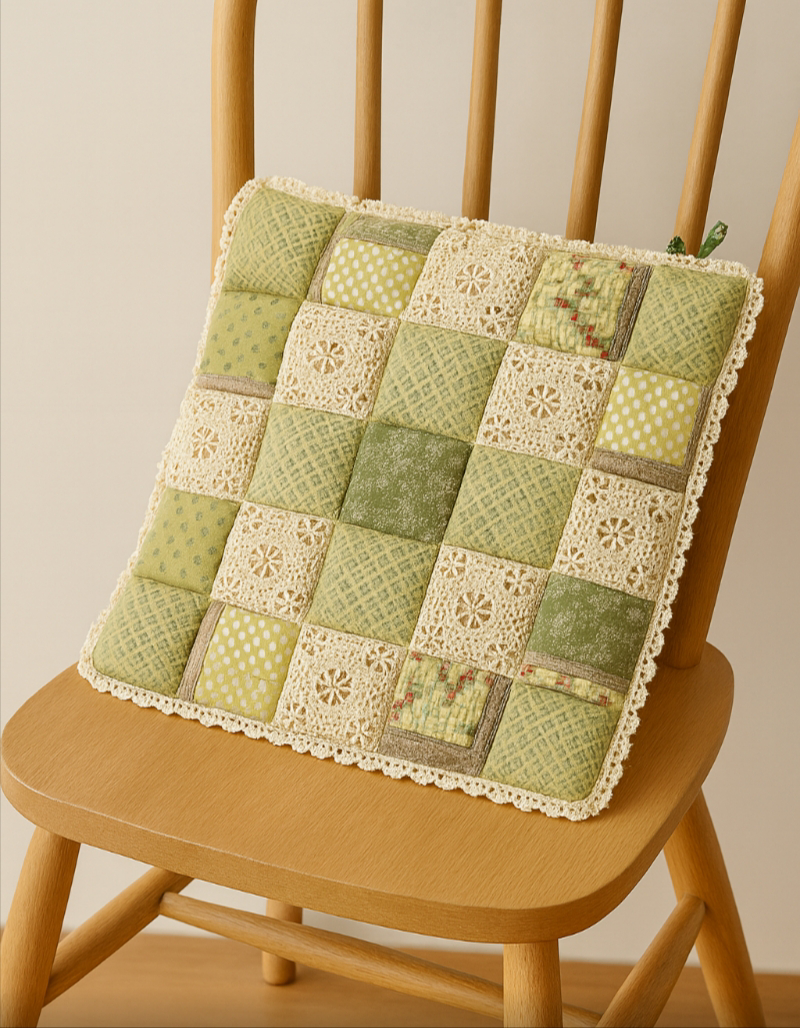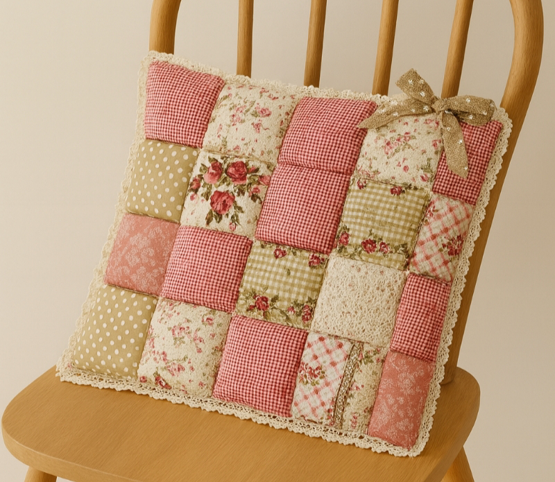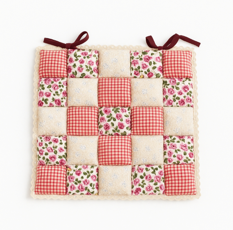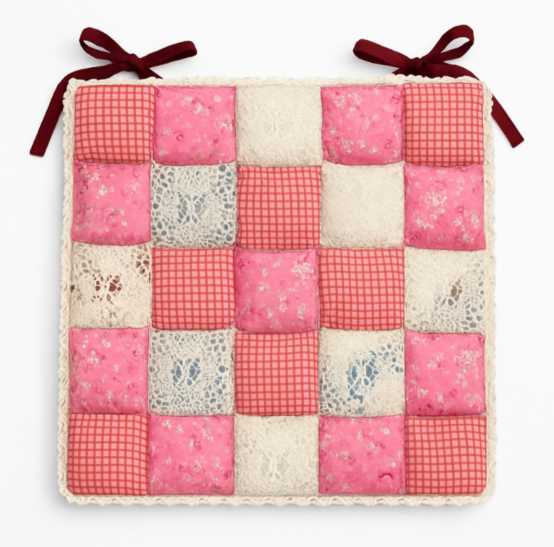 Ένα πανέμορφο μαξιλαράκι καρέκλας σε στυλ patchwork vintage, με ρομαντική δαντέλα περιμετρικά και απαλή, αφράτη γέμιση που προσφέρει άνεση και αισθητική σε κάθε χώρο. Ιδανικό για τραπεζαρία, κουζίνα ή καφετέρια, με κορδόνια για σταθερή εφαρμογή σε κάθε καρέκλα.