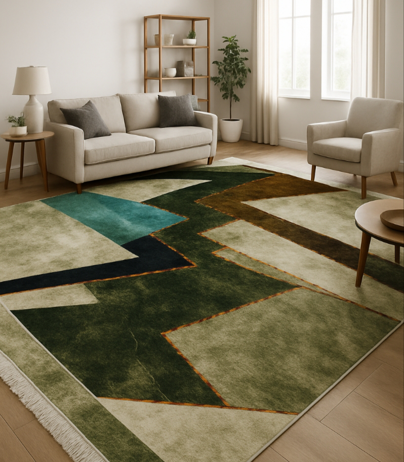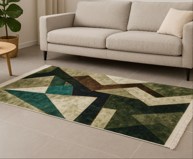 Το Γεωμετρικό Πολύχρωμο Χαλί είναι ιδανικό για να δώσει μοντέρνο ύφος σε κάθε χώρο. Με εντυπωσιακό σχέδιο σε αποχρώσεις πράσινου, καφέ και μπεζ, ταιριάζει τέλεια σε όλα τα δωμάτια. Η απαλή υφή και η υψηλή ποιότητα κατασκευής το κάνουν άνετο στο πάτημα, ενώ τα κρόσσια στις άκρες προσθέτουν μία διαχρονική λεπτομέρεια.